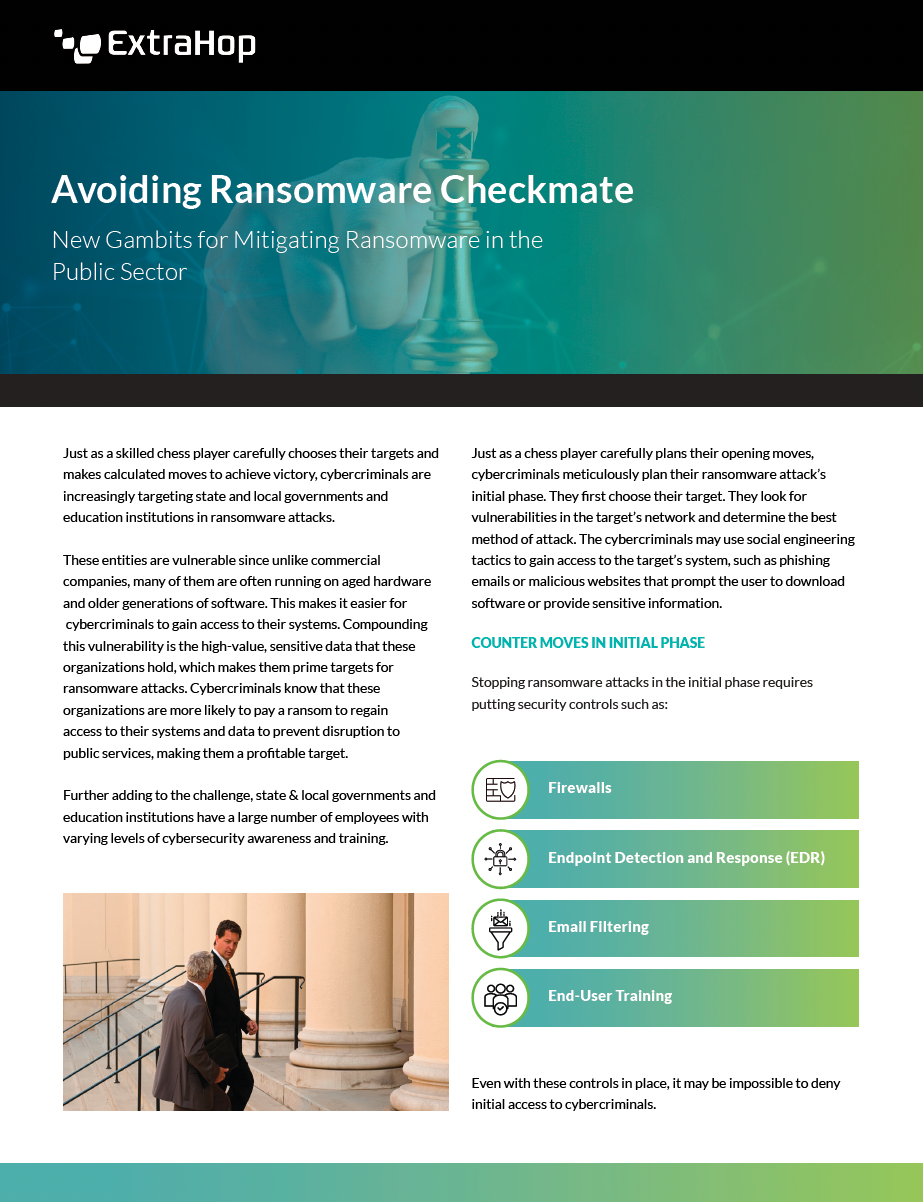 The Solution: ExtraHop's Reveal(x) 360 network detection and response (NDR) solution employs strategic decryption capabilities and behavior monitoring to identify anomalies. This allows defenders to catch and mitigate cyberattacks during the critical "mid-game" phase before extortion demands can be made.