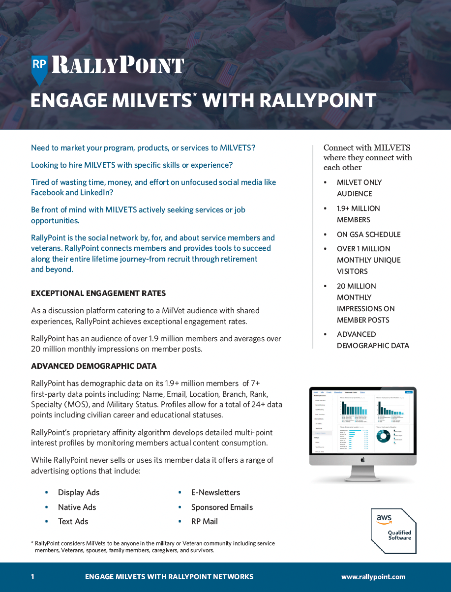 The Solution: RallyPoint is a specialized social network boasting over 1.9 million military and veteran members. Utilizing massive troves of demographic data and machine learning algorithms, RallyPoint connects the right people to targeted products, services, and recruitment campaigns throughout their lifetime journey.