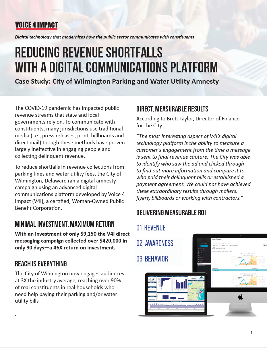 The Solution: The City of Wilmington utilized Voice 4 Impact's advanced digital communications platform to run a highly targeted digital amnesty campaign. This 1:1 engagement method bypassed cookies and unmeasurable print media to connect directly with real households, resulting in a 46X return on investment in just 90 days.